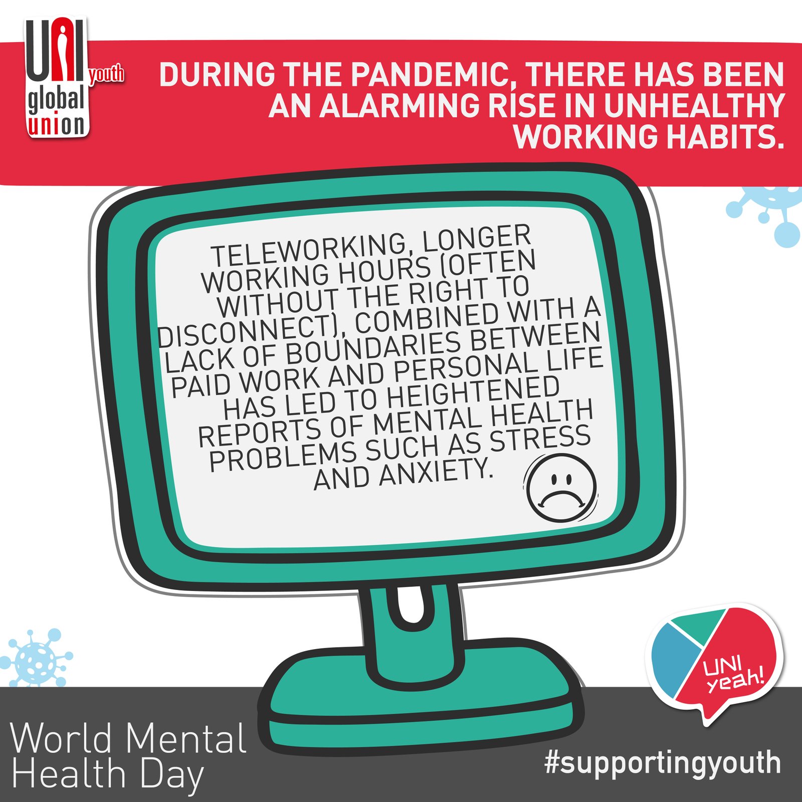 Millions of workers worldwide have been forced into teleworking, as countries across the globe have imposed lockdowns and social distancing measures to prevent the spread of the Covid-19. Watch the UNI Youth webinar on the consequences of the sudden switch to teleworking and the right to disconnect, and its impact on young workers.